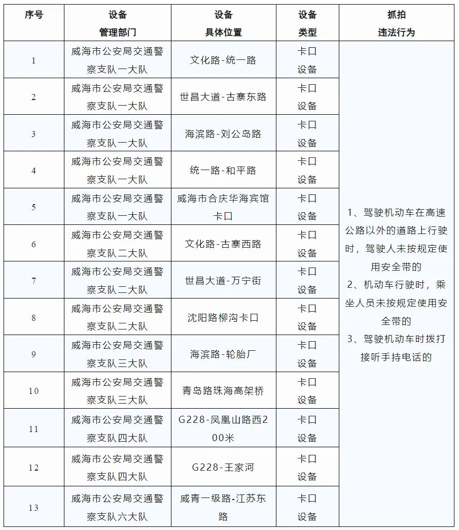 為保障道路交通安全,預(yù)防和減少交通事故的發(fā)生,根據(jù)《中華人民共和國(guó)道路交通安全法》及其實(shí)施條例等法律法規(guī)和相關(guān)技術(shù)規(guī)范的規(guī)定,依據(jù)《公安機(jī)關(guān)執(zhí)法公開(kāi)規(guī)定》,現(xiàn)將新增的13處交通技術(shù)監(jiān)控設(shè)備予以公示,自2024年9月1日起,將對(duì)有關(guān)交通違法行為進(jìn)行依法管理,請(qǐng)廣大道路交通參與者自覺(jué)遵守相關(guān)法律法規(guī),共同維護(hù)良好的道路交通秩序。