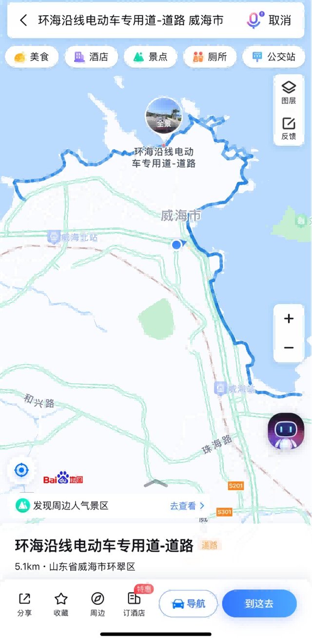 環(huán)海路沿線電動(dòng)車專用道”在百度地圖、高德地圖平臺(tái)均已上線,導(dǎo)航時(shí)請(qǐng)選擇騎行模式。