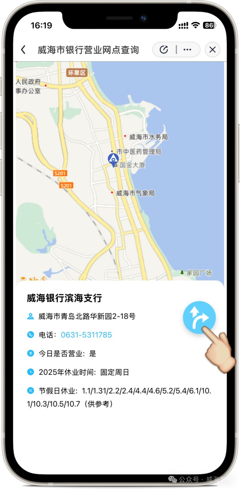 平時上班不方便,周末休假想去銀行辦理業(yè)務又不知道銀行是否休假?以后再也不用發(fā)愁了!近日,威海市大數據局聯(lián)合國家金融監(jiān)督管理總局威海監(jiān)管分局,在“愛山東”APP(威海分廳)上線了“威海市銀行營業(yè)網點查詢”應用,基于地圖為市民直觀便捷提供全市銀行網點營業(yè)休息信息的查詢服務,再也不用擔心白跑一趟了!
