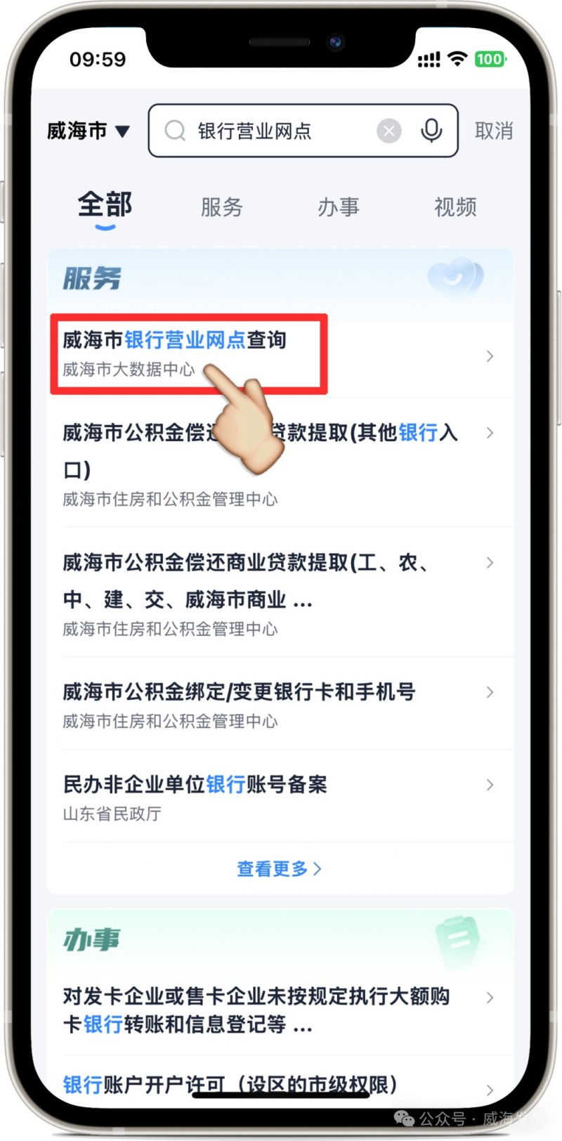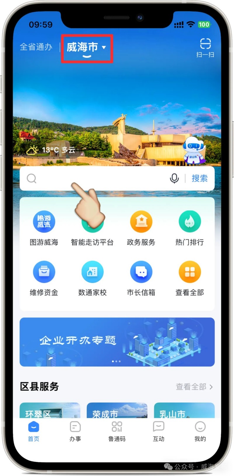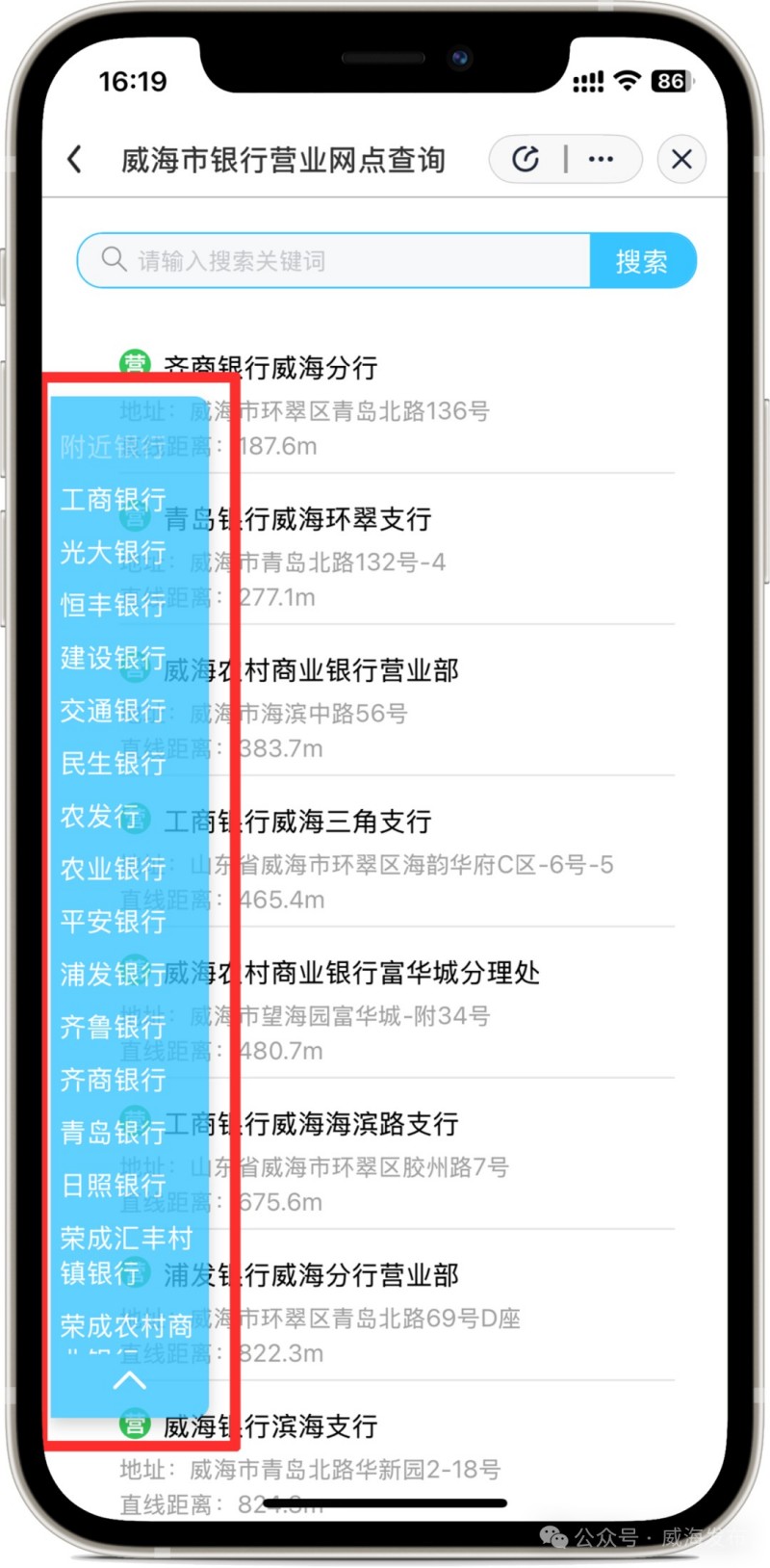進入“愛山東”APP后,在首頁左上角選擇進入“威海市”,在搜索框搜索關鍵詞“銀行營業(yè)網點”,點擊進入應用。