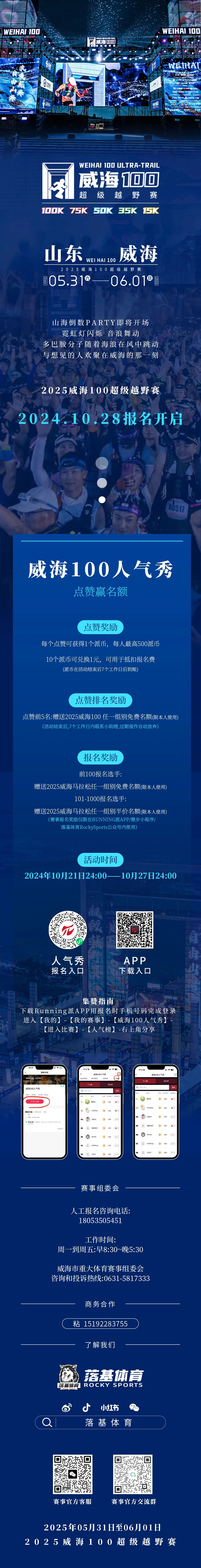 2025威海100超級越野賽由威海市重大體育賽事組委會主辦,威海市體育局、威海市體育總會承辦,煙臺落基體育有限公司具體負責賽事運營。賽事設(shè)100KM、75KM、50KM、30KM、15KM共5個競賽距離,將接受不超過3000人報名參賽。